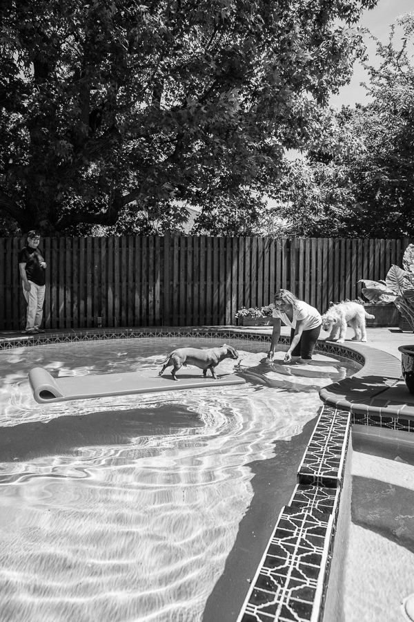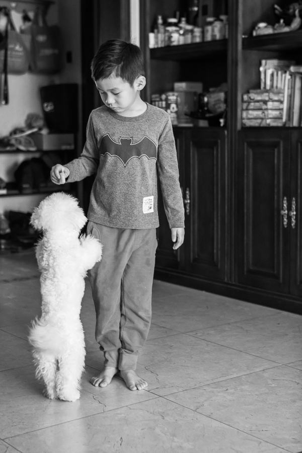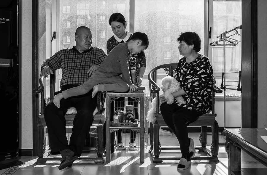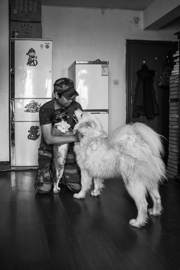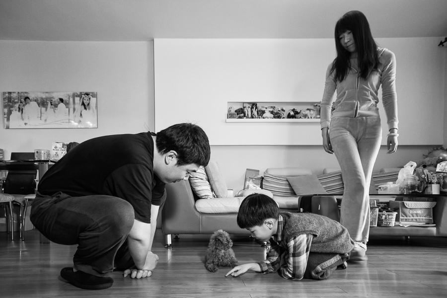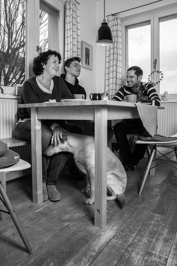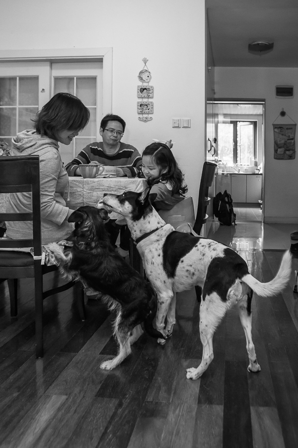 The photographic work MOM, DAD, DOG is concerned with interactions and emotions within families with dogs. For thousands of years, humans and dogs have been living together in intense relationships. In our modern world, dogs play different roles, they have specific tasks and are emotional companions. But the relationship between family members can also be influenced and changed by dogs. Intercultural differences and similarities are also visible. The series, launched in 2015, has not yet been finalized. So far, pictures have been created in Germany, Poland, the US, China and Japan.